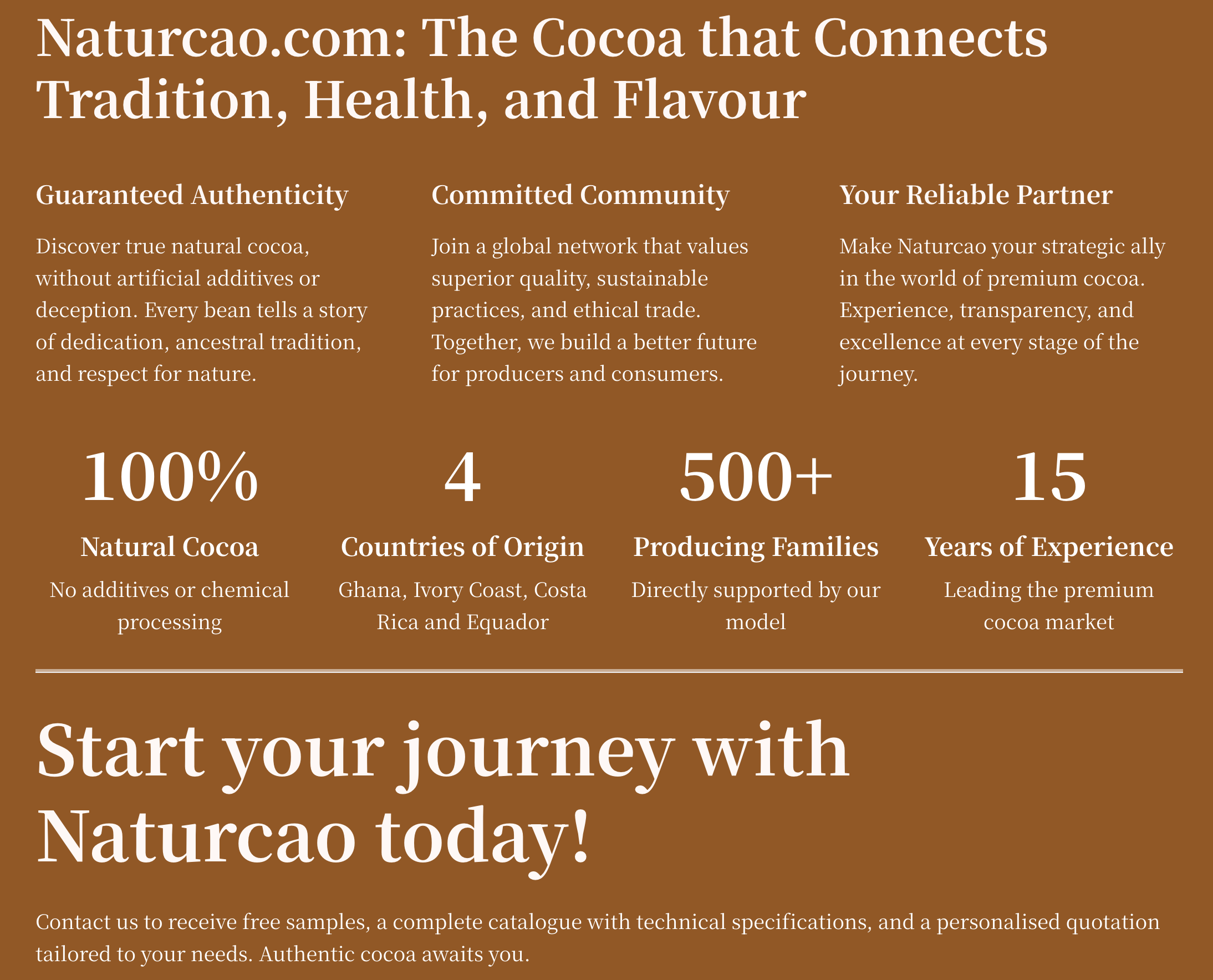 Naturcao positions itself as a reliable strategic partner for businesses seeking premium cocoa with complete traceability. We offer flexibility, technical support, and a genuine commitment to quality that transcends a simple commercial transaction.